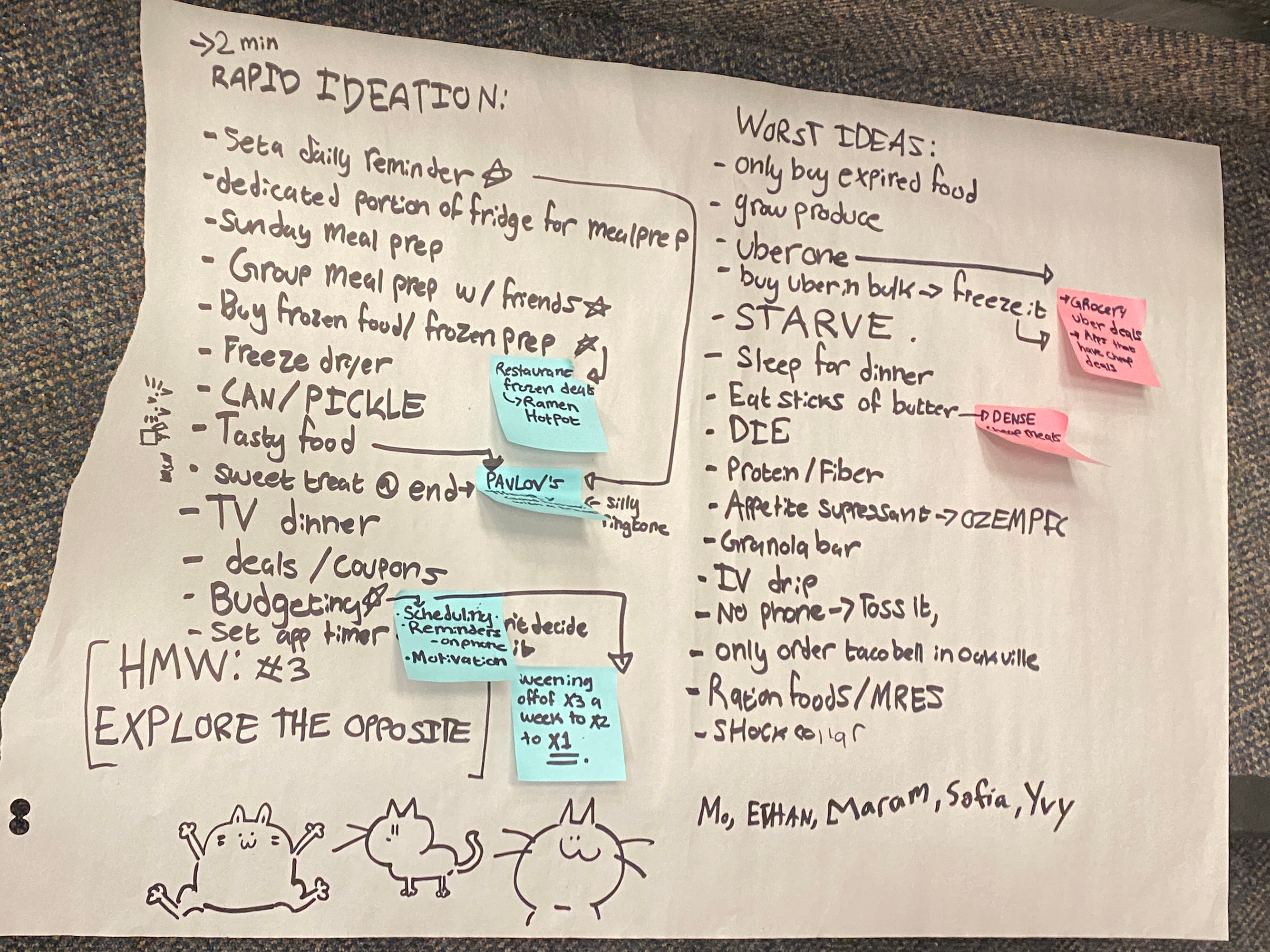 For this activity, we tested our divergent thinking skills by putting out a wide range of ideas in a broader perspective. In class, we engaged in a problem-solving exercise using the How Might We (HMW) framework. The first step was to choose an HMW question, based off of our professors problem, regarding how she doesn't have the motivation/time to prepare healthy meals.