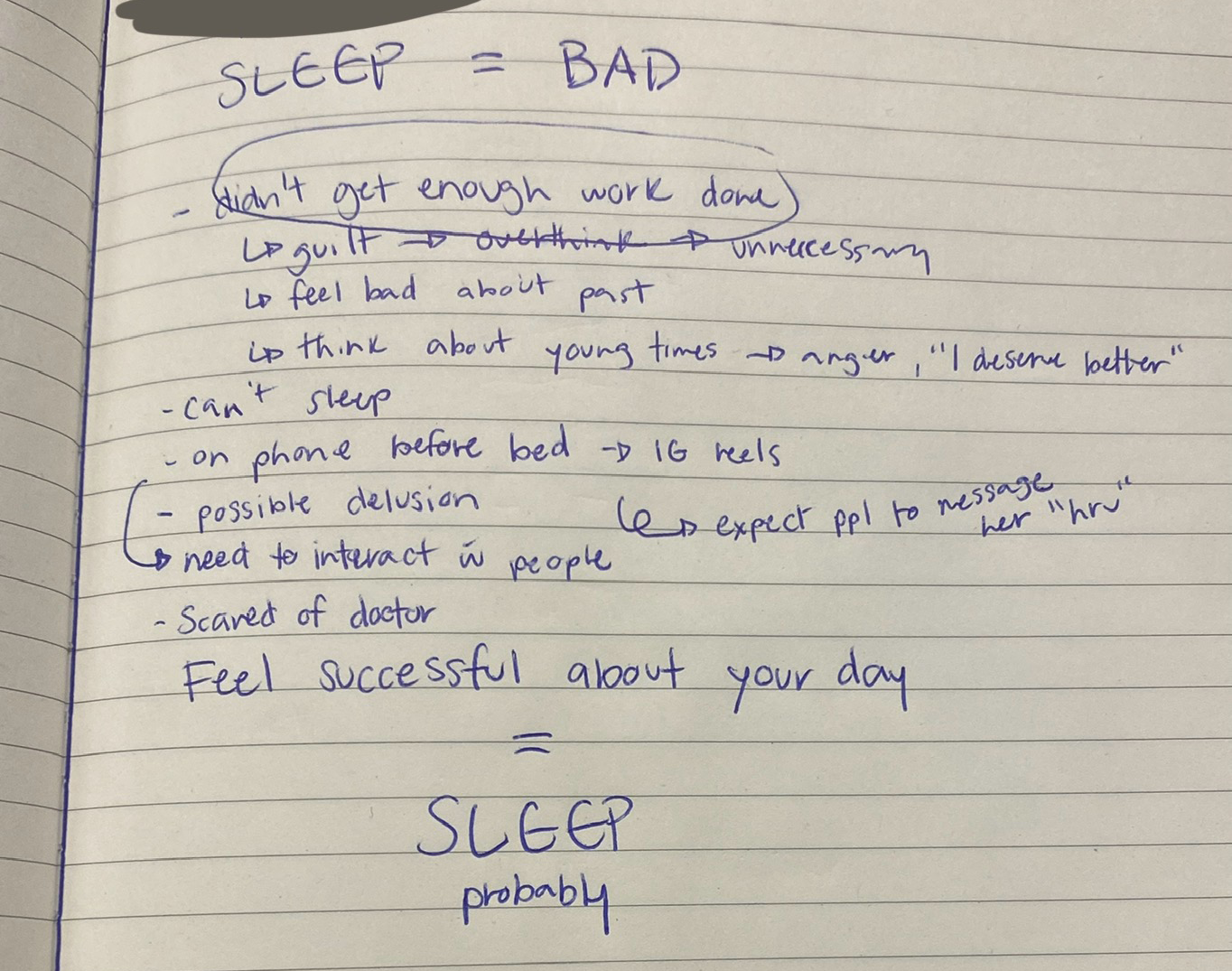 After asking more questions, I realized that their struggle was not just about using their phone or overthinking, but rather a result of an underlying feeling of dissatisfaction. The main reason they were unable to sleep well was that they did not feel a sense of accomplishment or success in their daily activities. This lack of fulfillment created a lingering sense of stress, which then led to overthinking and, ultimately, disrupted their ability to fall asleep peacefully.